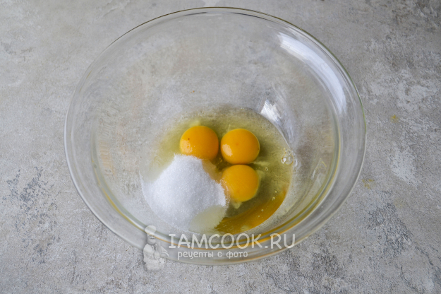 В миску разбейте яйца, всыпьте сахар и щепотку соли.