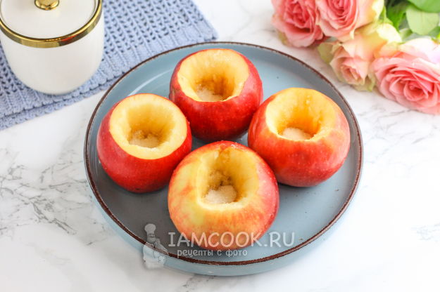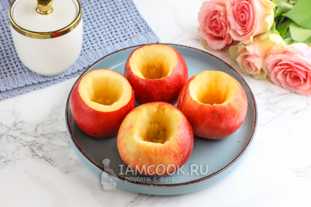 Фрукты тщательно промойте в горячей воде, чтобы смыть парафин. В настоящее время практически каждое яблоко им обрабатывают - так они дольше хранятся. Срежьте верхушку фрукта и вырежьте семенные блоки, стараясь не пробить дно. Если пробьете дно, то весь сироп из них вытечет. Промойте очищенные яблоки в воде.