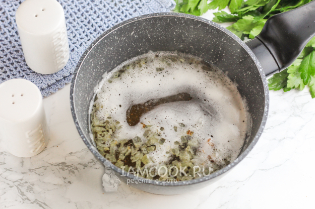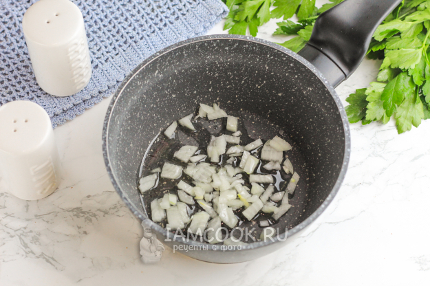 Очистите луковицу от шелухи и промойте в воде. Нарежьте мелкими кубиками и пассеруйте в растительном масле примерно 3-5 минут, до румяности.