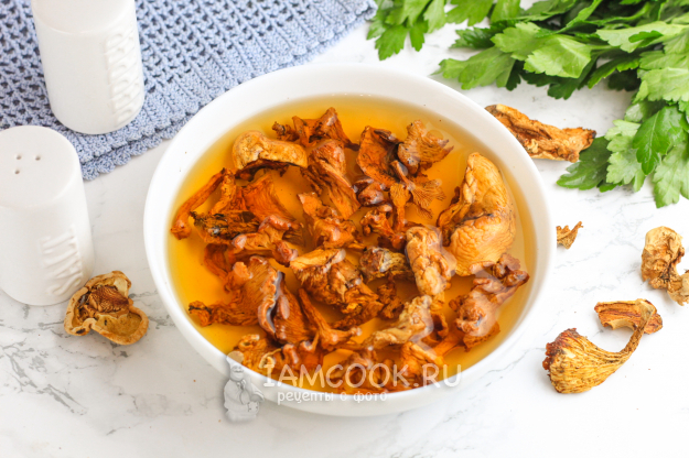 Сушеные грибы (в моем варианте - лисички) промойте холодной водой, смывая пыль. Затем выложите их в салатник или глубокую емкость и залейте горячей водой. Оставьте на полчаса, а можно и на 1-2 часа, чтобы грибы набухли.