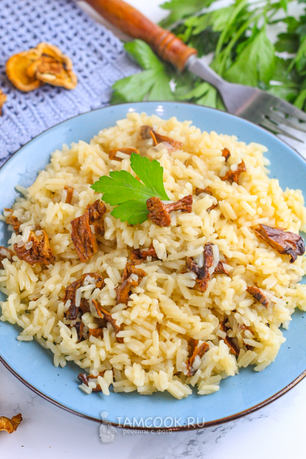 Выложите ароматный рис с сушеными грибами на тарелки и подайте к столу горячим. Особенно вкусен он со сметаной или постным майонезом, салатом из свежих овощей.