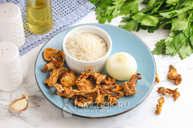 Продукты для приготовления риса с сушеными грибами - перед вами!