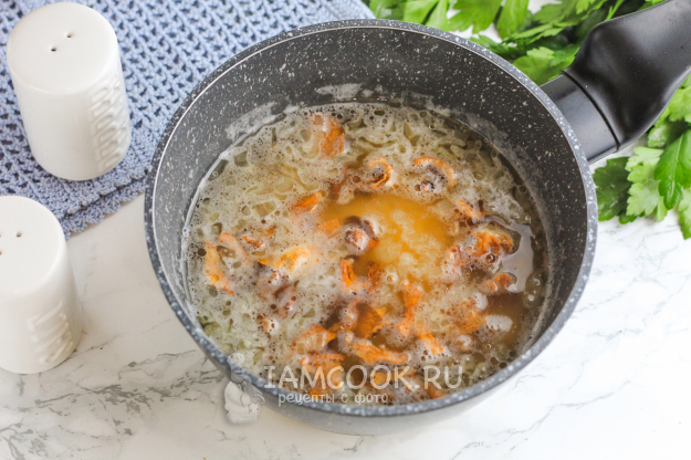 Влейте к обжаренному луку грибной бульон, а сами грибы нарежьте на части. Доведите жидкость в емкости до кипения и всыпьте соль. Другие пряности или приправы лучше не добавлять, чтобы не перебить грибной аромат.
