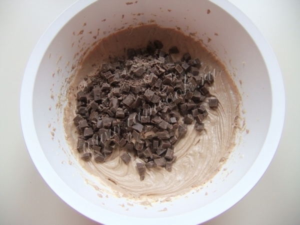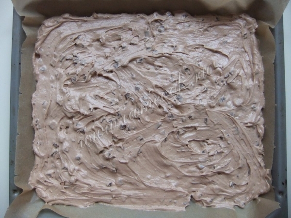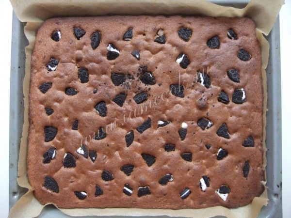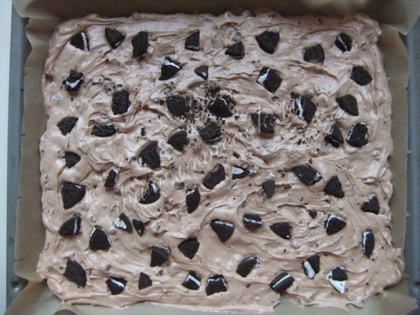 Печенье орео ломаем на кусочки, распределяем по тесту и немного вдавливаем.