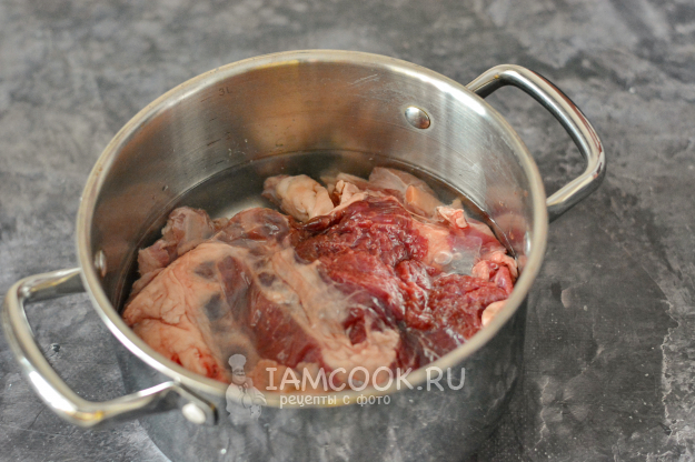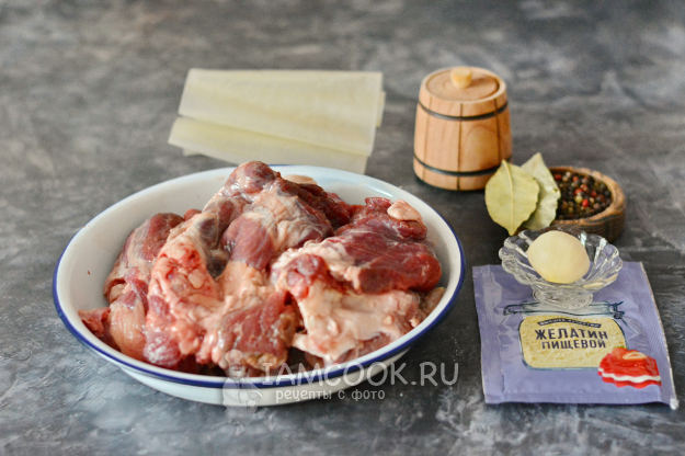 Мясо полностью разморозьте, ополосните и выложите в кастрюлю. Залейте водой так, чтобы она только слегка покрывала мясо. Много воды использовать не стоит, нам нужен очень концентрированный бульон, который потом зажелируется.