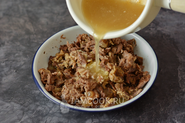 Бульон с растворенным желатином влейте к нарезанной говядине с чесноком и перцем.