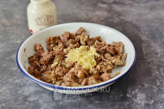 Мясо извлеките из бульона, остудите, чтобы не обжечься, и мелко нарежьте.