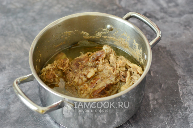 Для того чтобы связать воедино в сальтисоне кусочки мяса, нужно небольшое количество бульона. По объему его должно быть примерно вдвое-втрое меньше мяса.