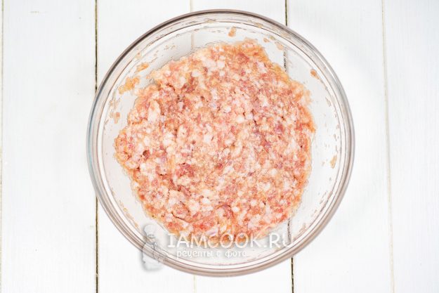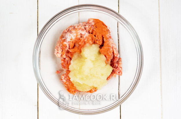 Фарш выложим в просторную миску, добавим соль, перец молотый и весь тертый лук вместе с соком.