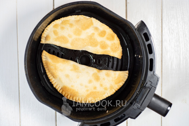 Две заготовки чебуреков выложим на решетку чаши аэрогриля. Будем готовить чебуреки в аэрогриле при температуре в 200 градусов 15-20 минут с одной стороны, затем, достав чашу из аэрогриля, чебуреки перевернем на другую сторону и продолжим выпекать еще 5-8 минут. Время приготовления контролируйте самостоятельно, ориентируясь на свойства своего аэрогриля!