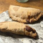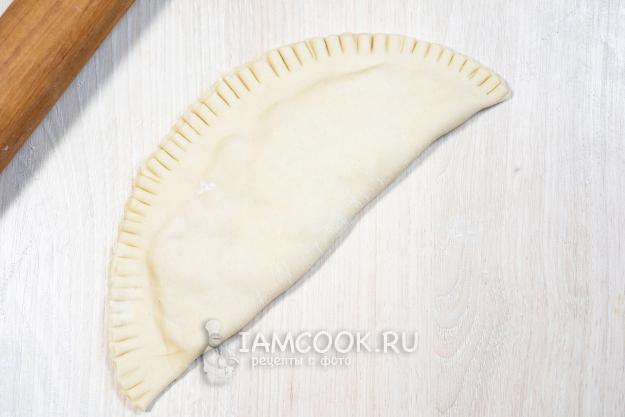 Свободной частью раскатанного теста накроем начинку и вилкой хорошо скрепим края теста, формируя заготовку чебурека.