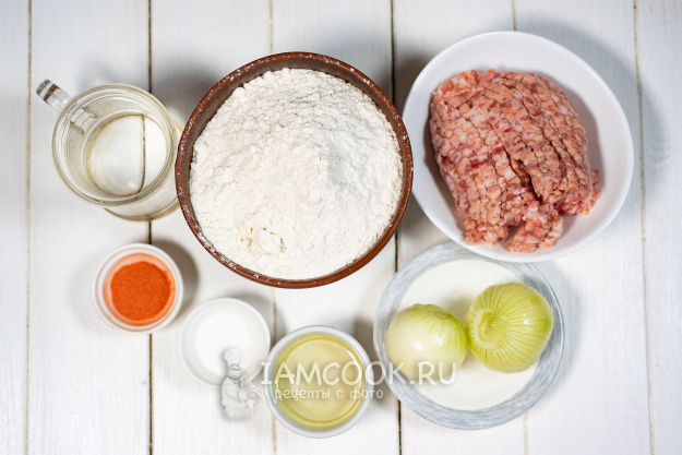 Соберём все необходимые ингредиенты для приготовления чебуреков в аэрогриле. Сразу же почистим лук и ополоснем его в проточной воде.