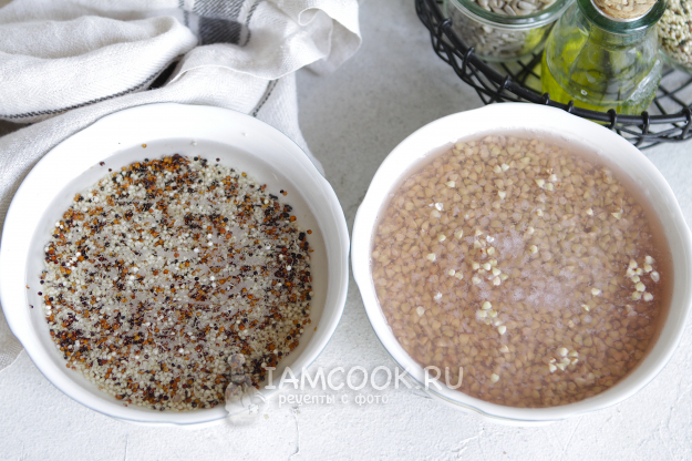 Обе крупы залить водой и оставить на столе на 8-10 часов. Я замачивала крупы на ночь.