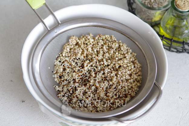 По истечении указанного времени под проточной водой тщательно промыть зеленую гречку и киноа. Откинуть крупы на дуршлаг, чтобы стекла вся лишняя жидкость.