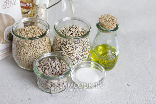 Все необходимые продукты для выпечки безглютенового хлеба из зеленой гречки и киноа - перед вами.