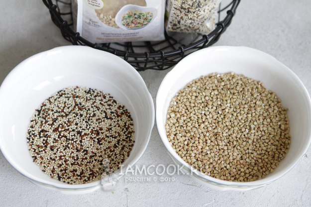 Соблюдая строго все пропорции и рекомендации, не сомневайтесь, хлеб у вас получится. Подготовьте две небольшие пиалы или контейнер с крышкой. Один заполните киноа, другой - зеленой гречкой.