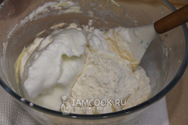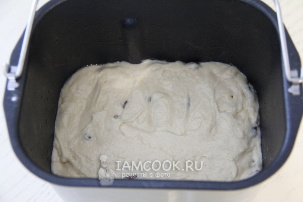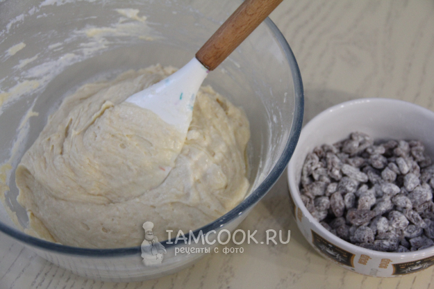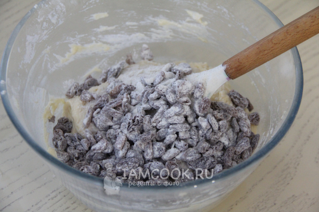 Перемешивать тесто лопаткой до однородного состояния. 1 столовую ложку муки из общей массы добавить к изюму и перемешать.