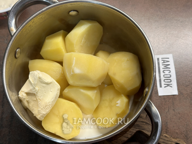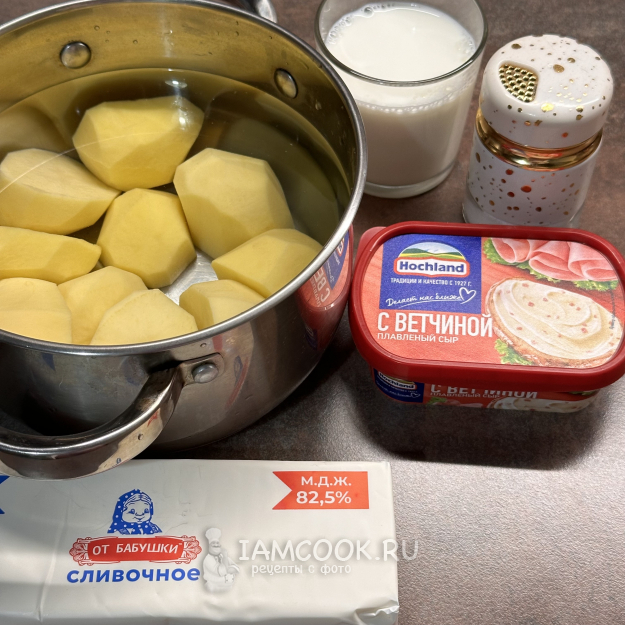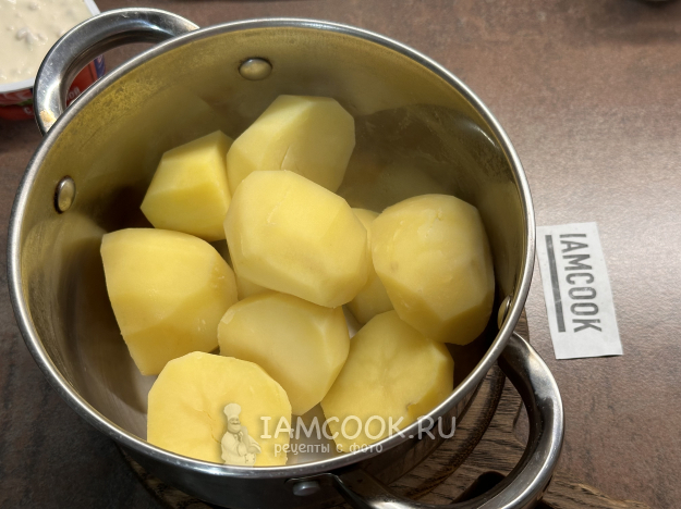 Подготовим ингредиенты для картофельного пюре с плавленым сыром. Картофель чистим, моем, укладываем в кастрюлю с водой.