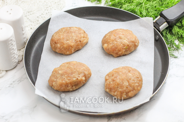 Разогрейте сковороду и выложите на нее пергаментную бумагу. На бумагу - заготовки котлет и убавьте нагрев до среднего. Обжаривайте котлеты на пергаменте на сковороде примерно 3-4 минуты, затем переверните их на другую сторону.