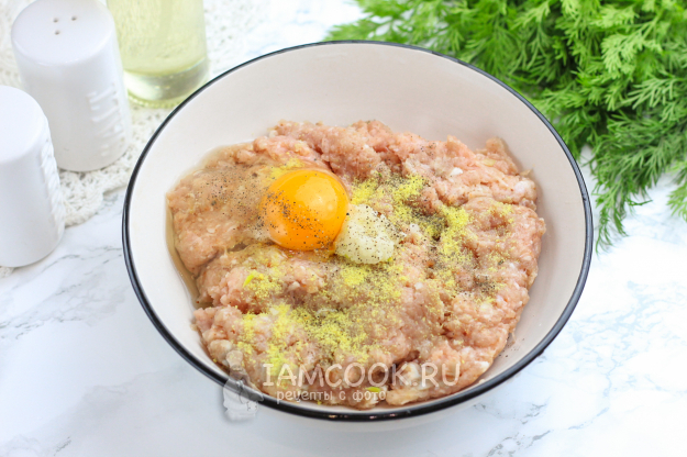 Выложите свиной фарш в миску или салатник, добавьте приправу для мяса, соль и молотый черный перец. Очистите мелкую луковицу от шелухи, промойте ее и натрите на терке для пюре. Вбейте мелкое куриное яйцо и тщательно перемешайте всё в течение 4-5 минут. Желательно вымешать фарш до белых нитей, чтобы они в нем тянулись.