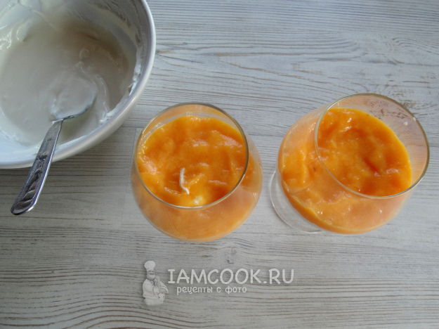 В креманки, бокалы или стаканы выложить, чередуя, творожную массу и пюре из хурмы.