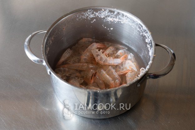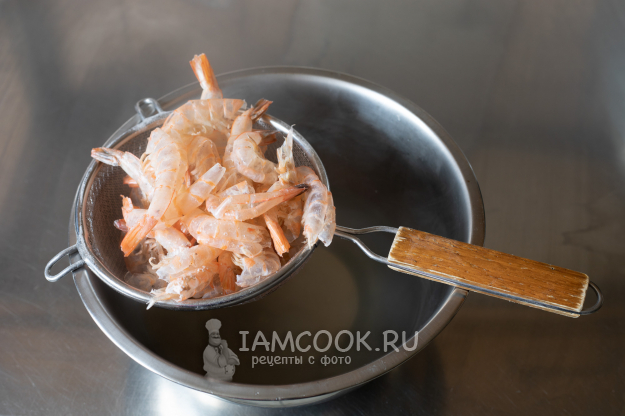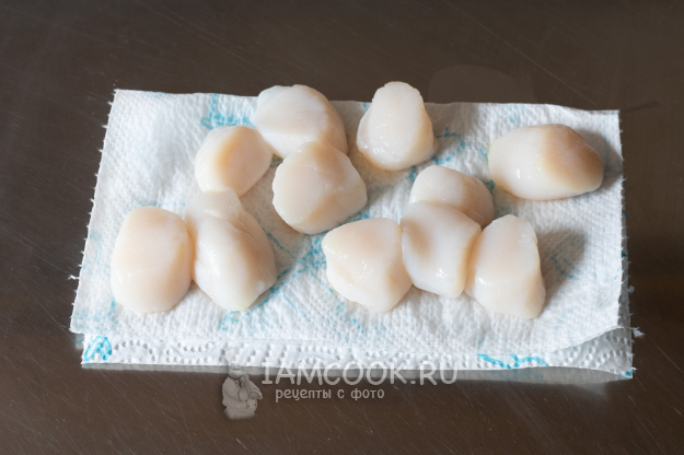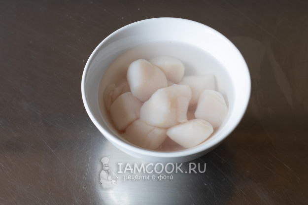 На начало приготовления этого блюда креветки и гребешки, если они из заморозки, должны полностью оттаять. Оттайка щадящая (много часов в холодильнике).