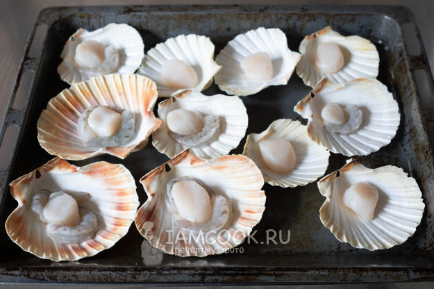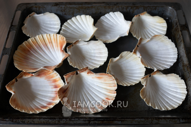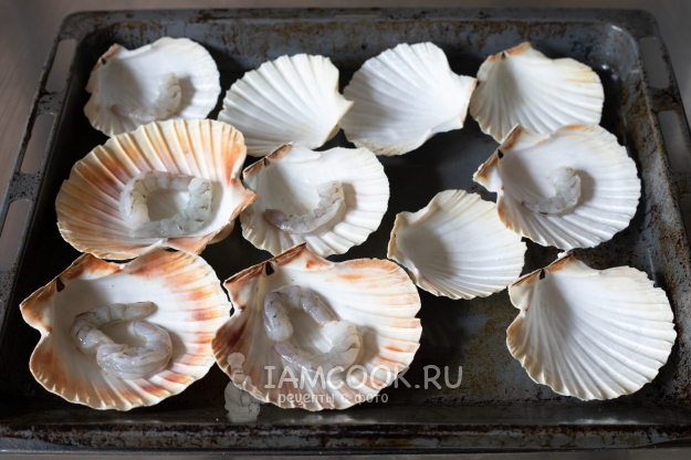 Раскладываем гребешков в самое глубокое место раковин, стараемся, чтобы они не сильно выступали над кромкой. Смотрим, как раковины стоят на противне: прикидываем на глаз, не будет ли из них выливаться жидкость. Если нужно, то можно подложить под отдельные раковины кусочки скомканной фольги. Но мне обычно удаётся так прислонить их одну к другой, что дополнительные опоры не требуются.
