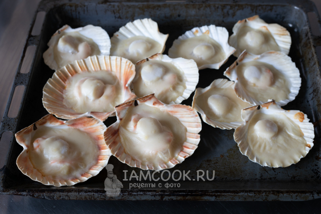Разливаем соус по раковинам. Следим, чтобы он обязательно полностью покрыл гребешков.