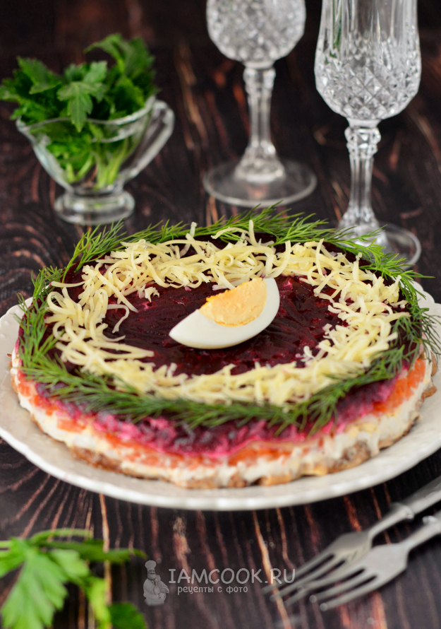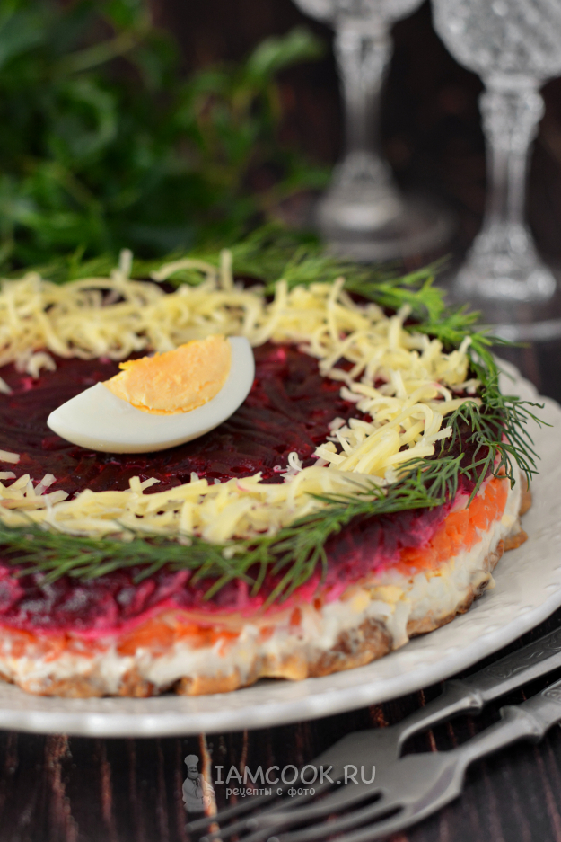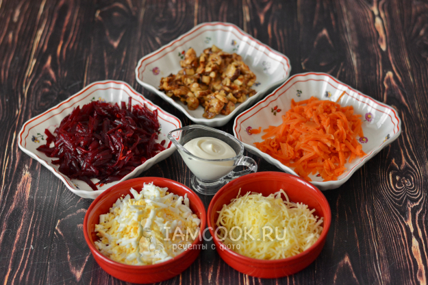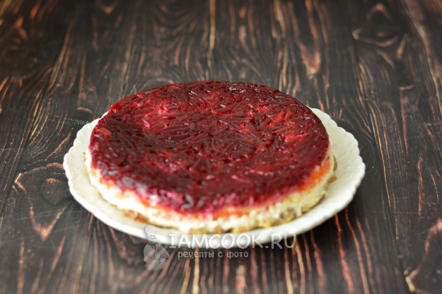 Итак, первым слоем выкладываем натёртую на тёрке варёную свеклу, чуть подсаливаем её, уплотняем ложкой и смазываем майонезом.