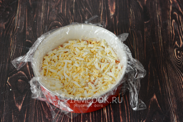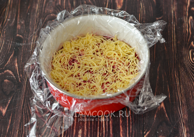 Следующий слой - натёртый на мелкой тёрке сыр. Поскольку сыр жирный, то его смазывать майонезом не требуется, просто уплотните этот слой.