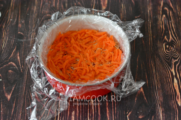 После сыра - слой моркови. Морковь также рекомендую слегка подсолить. Смажьте слой моркови майонезом и уплотните слой.