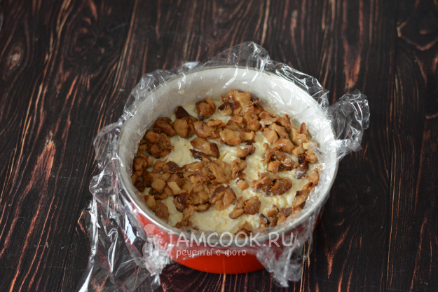Ну и последний слой - обжаренные грибы. Этот слой ничем не смазываем, так как после переворачивания грибы окажутся внизу.