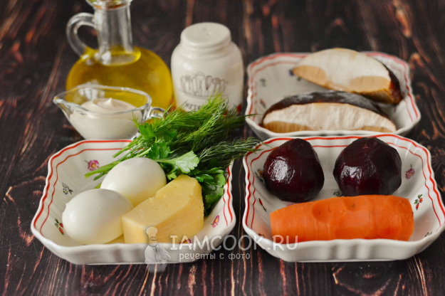Соберите все необходимые продукты для приготовления салата "Генеральский" с грибами.