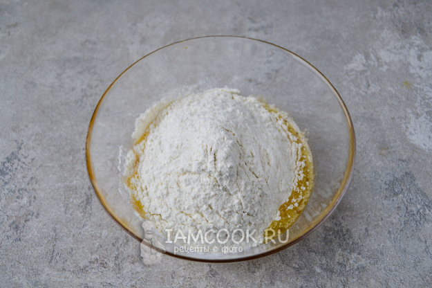 Просейте в миску муку, перемешайте сначала ложкой. Если яйца не крупные, то муки понадобится примерно 160-170 г. В любом случае муку добавляйте постепенно.