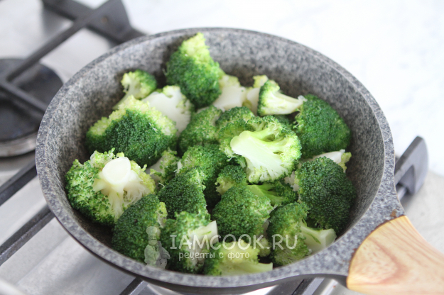 Добавить соцветия капусты брокколи и хорошо ее прогреть со всех сторон. Важно, брокколи мы не зажариваем, а прогреваем.