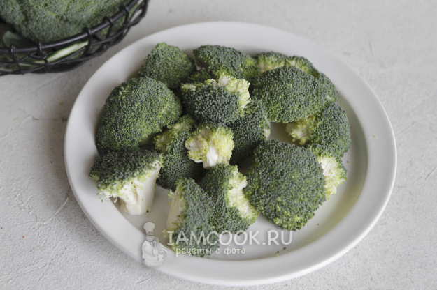Выбирая брокколи, обратите внимание на ее внешний вид. Капуста должна иметь насыщенный зеленый оттенок, соцветия должны быть плотными, не рассыпаться. Вилок брокколи разделить острым ножом на соцветия одинакового размера.