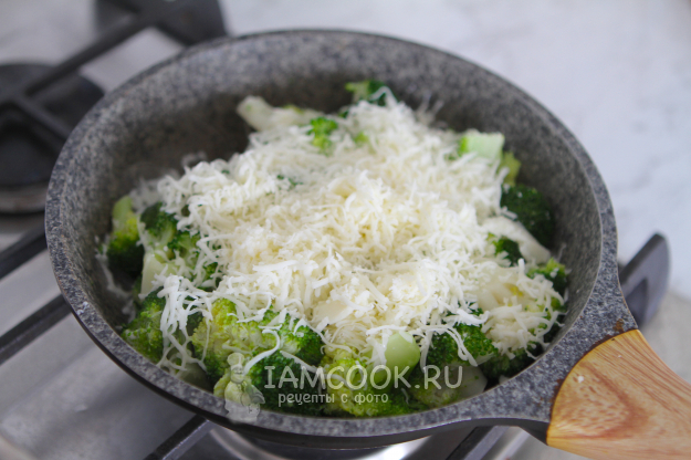 Добавить два вида сыра. Закрыть сковороду крышкой и выключить огонь. Оставить капусту брокколи с сыром на сковороде под крышкой на 5-7 минут.