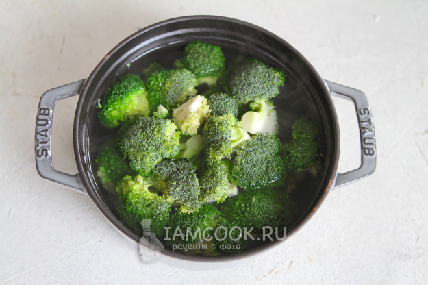Кастрюлю заполнить водой, вскипятить и посолить воду. На 1 литр я обычно добавляю 2/3 щепотки соли. Соцветия брокколи переложить в кастрюлю и бланшировать не дольше 3 минут.