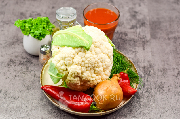 Соберите продукты для приготовления цветной капусты в томатном соусе.