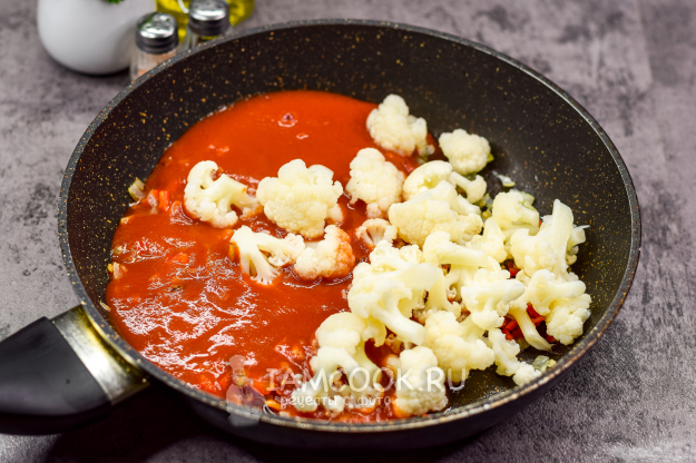 Добавьте в сковороду томатный соус, соль и перец, сушеный чеснок. Воду с цветной капусты слейте, а сами соцветия переложите в сковороду.