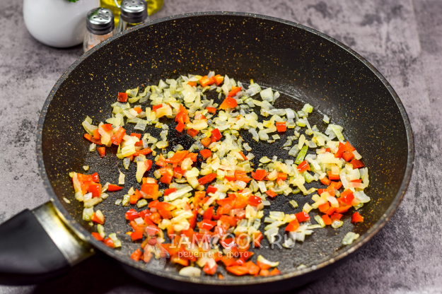 В сковороде разогрейте немного оливкового масла, выложите лук и перец, пассеруйте овощи несколько минут.