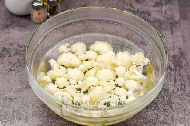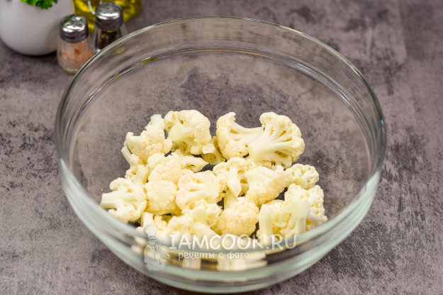 Цветную капусту разберите на небольшие соцветия, переложите в миску.
