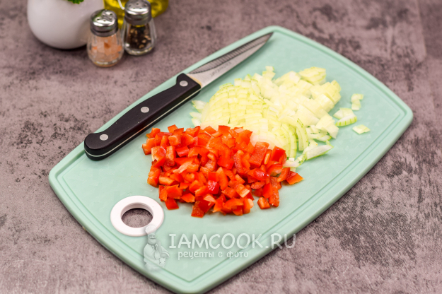 Тем временем подготовьте овощи - очистите лук и сладкий перец, сполосните овощи и просушите. После нарежьте лук небольшими кубиками, перец также нарежьте небольшими кубиками.