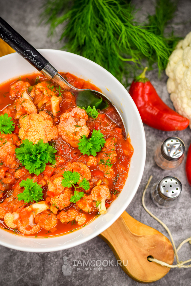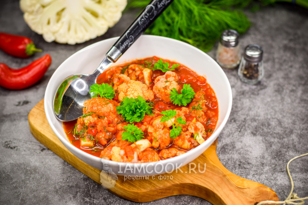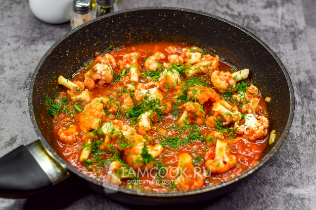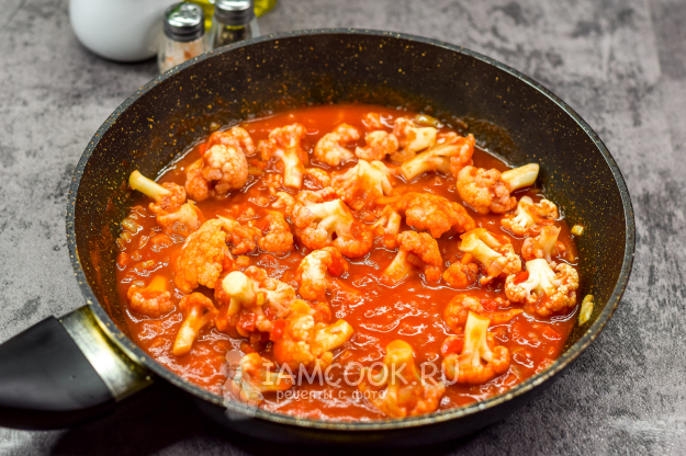 Тушите цветную капусту в томатном соусе 5 минут на небольшом огне.