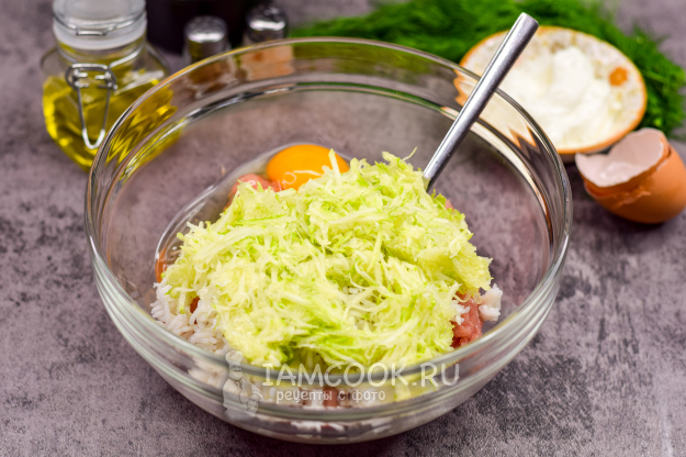 Кабачок ополосните и просушите, после натрите его на мелкой терке. Тертый кабачок хорошо отожмите, чтобы ушла лишняя жидкость, и добавьте в фарш.