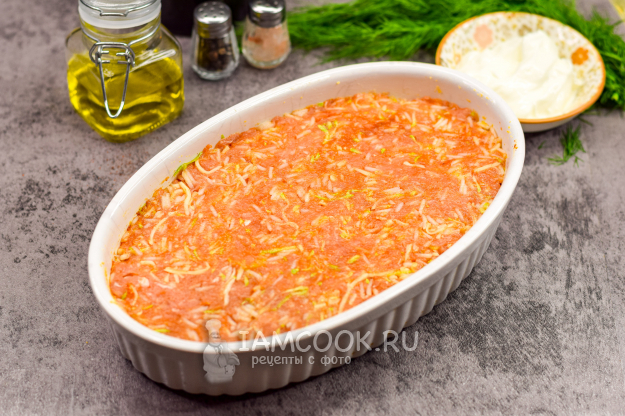Выложите подготовленные ингредиенты для запеканки в форму.