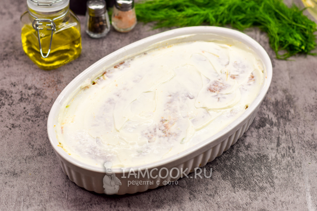 Поверх смажьте все сметаной. Переставьте форму в духовку и запекайте при 180 градусах 35-40 минут, обязательно прикрыв форму фольгой.