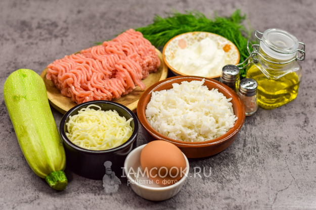 Подготовьте все необходимые продукты для запеканки из кабачков с фаршем и рисом. Рис предварительно отварите.