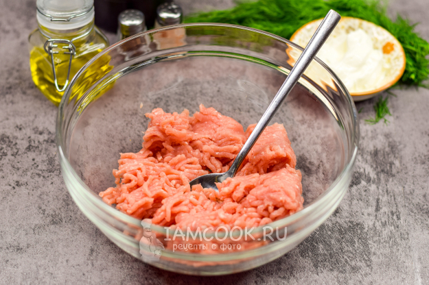 В глубокую миску переложите фарш. В моем варианте используется свинина, также можно взять говядину или индейку, курицу, либо использовать смешанный фарш.