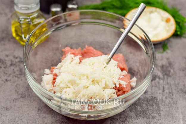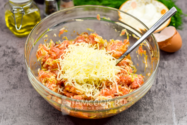 Перемешайте все и добавьте тертый сыр - половину от всей порции. Еще раз тщательно все перемешайте.